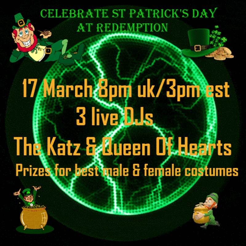 CELEBRATE ST PATRICK’S DAY AT REDEMPTION…..3 LIVE DJS….THE KATZ & QUEEN OF HEARTS….PRIZES & TRIVIA….PRIZES FOR THE BEST MALE & FEMALE OUTFIT….INVITE YOUR FRIENDS & MAKE SOME NEW ONES!!!!!!!!!!!